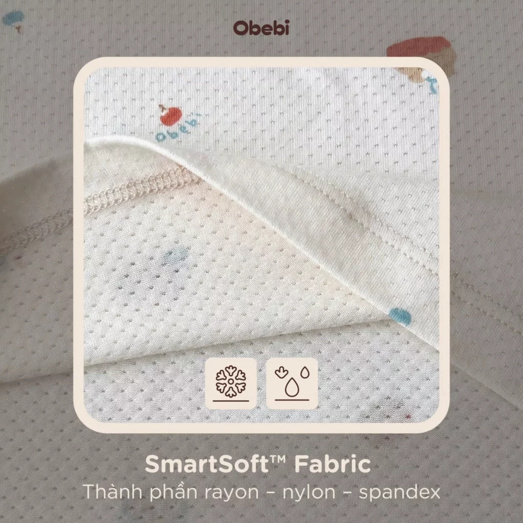 Quan sát kỹ cấu trúc vải, SmartSoft™ có lỗ thoáng khí siêu nhỏ li ti dày đặc trên bề mặt — đây chính là “bí kíp” giúp vải lưu thông không khí cực tốt, hơi nóng thoát ra ngoài nhanh, bé không bị bí và nóng ran dù vận động nhiều. Kết hợp với sợi rayon mềm mướt và spandex co giãn, SmartSoft™ vừa mát vừa cực kỳ thoải mái khi mặc.