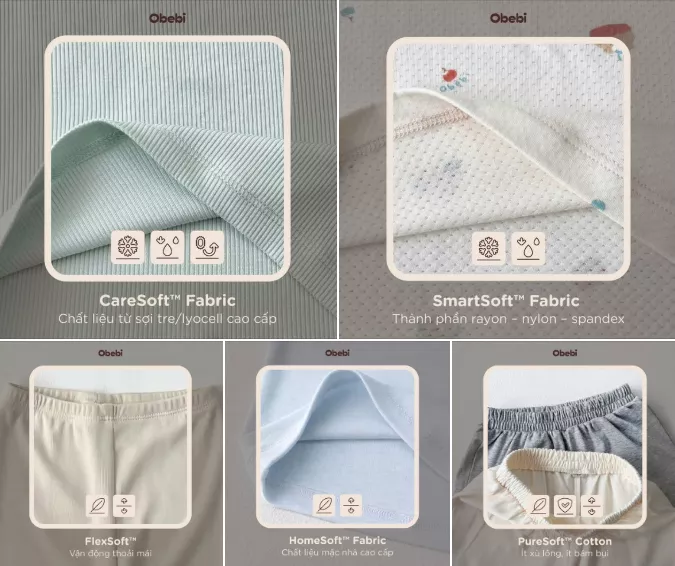 Chất liệu đầu tiên phải kể đến là PureSoft™ Cotton — dòng vải cotton được Obebi cải tiến để khắc phục nhược điểm thường gặp nhất của đồ cotton thông thường: xù lông và bám bụi sau nhiều lần giặt.